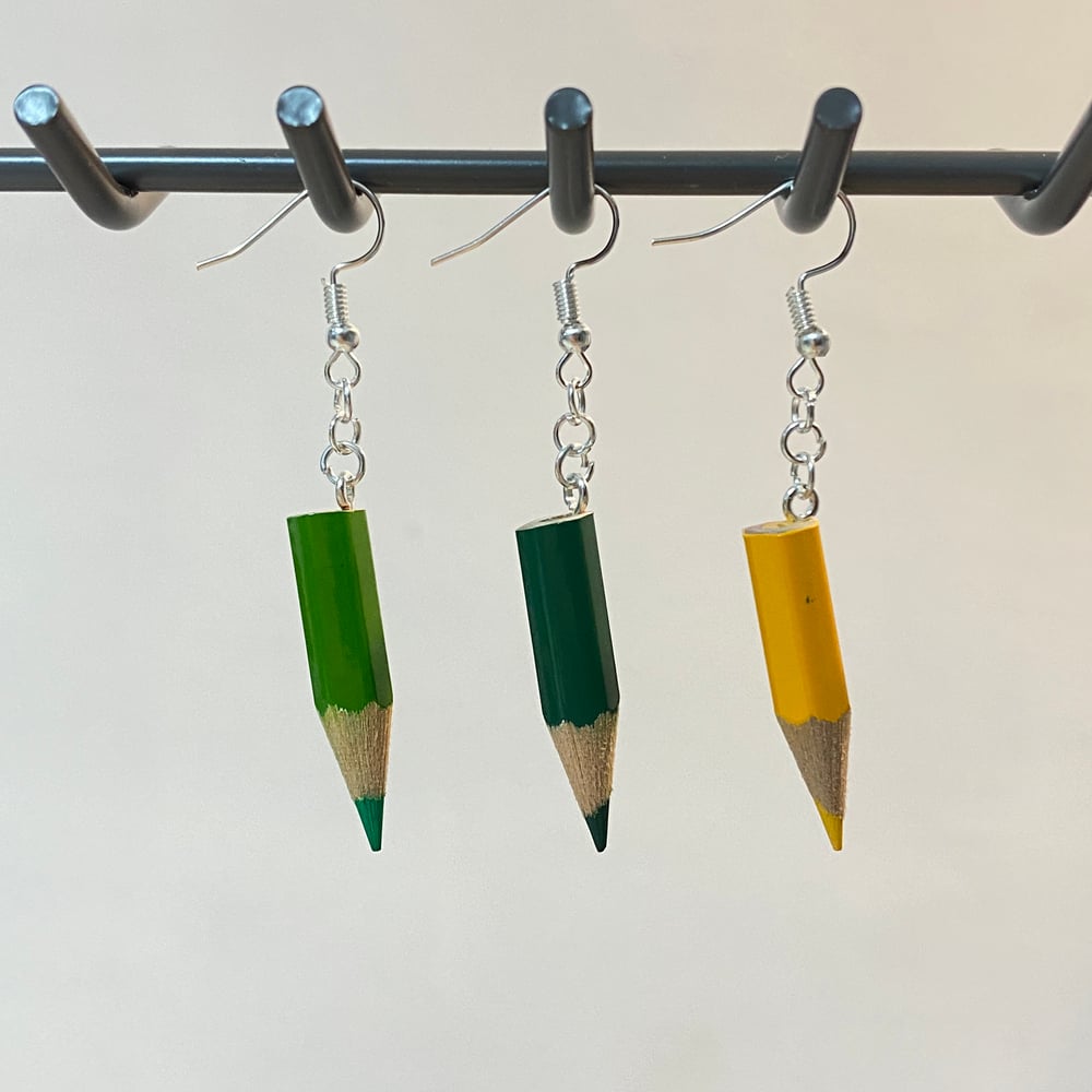 We are made of real colour pencil with surgical steel studs (hypoallergenic) and rubber back stoppers, measuring 0.5cm x 2cm and weighing 5g per pair.